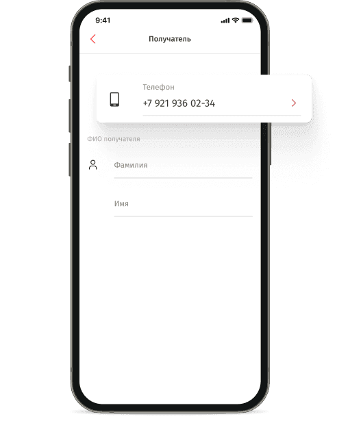 Введите номер телефона, фамилию, имя и отчество получателя как в паспорте или иные необходимые данные