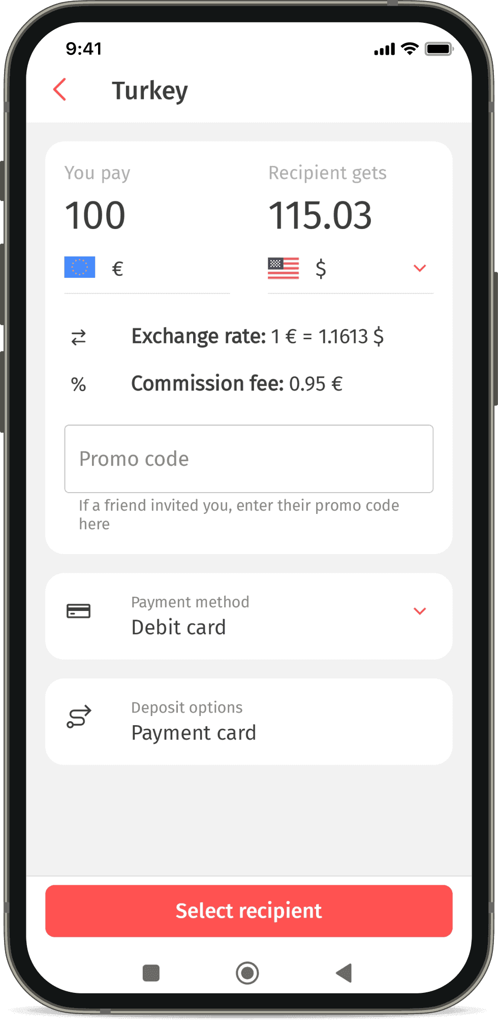 After registration, on the main screen, tap “Send transfer”, select the sending country and the method of receiving money. The field to enter the promo code is located below the information about the exchange rate and fees