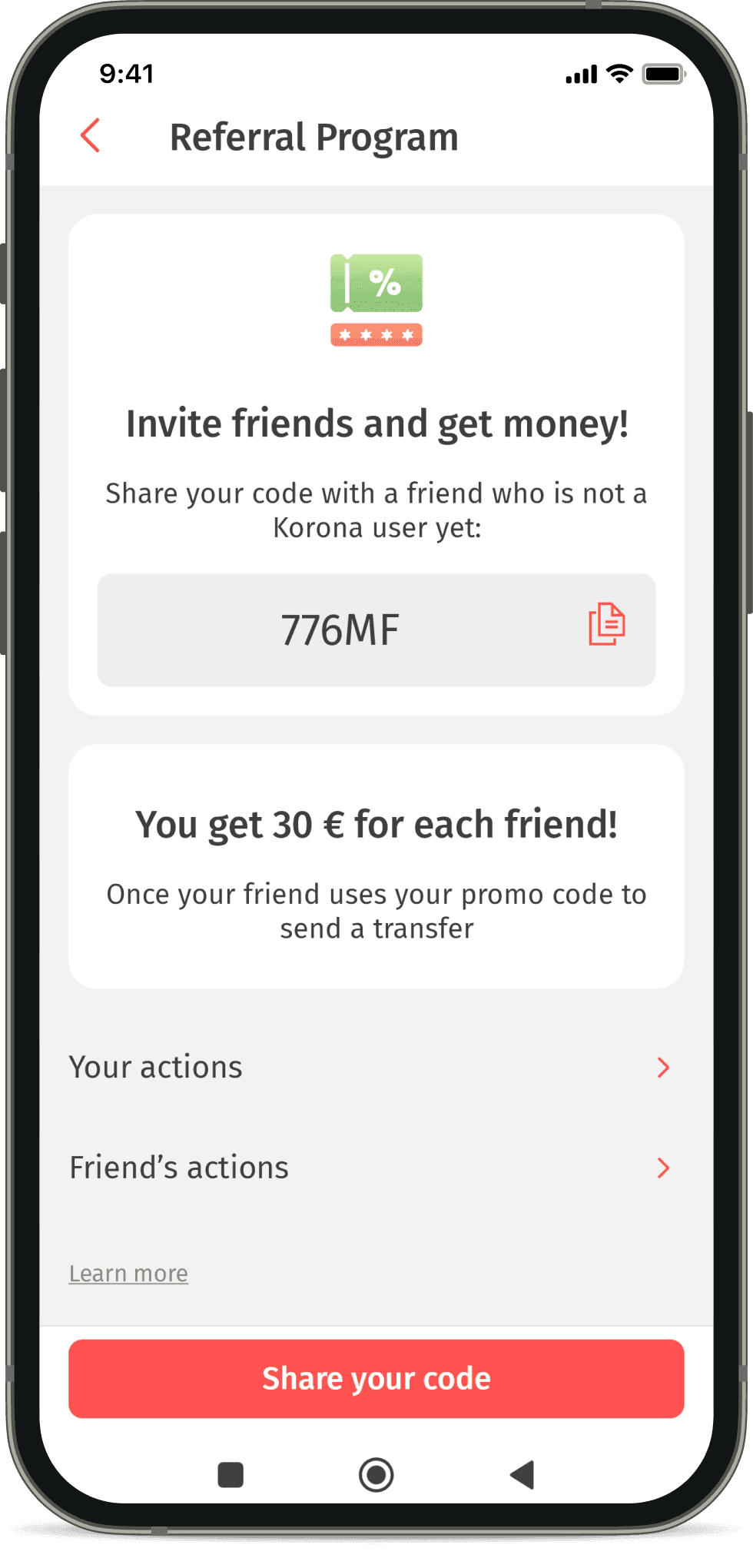 - 3Your friend will receive €30 as a reward, and you will get your personal promo code in the “Referral Program” section.