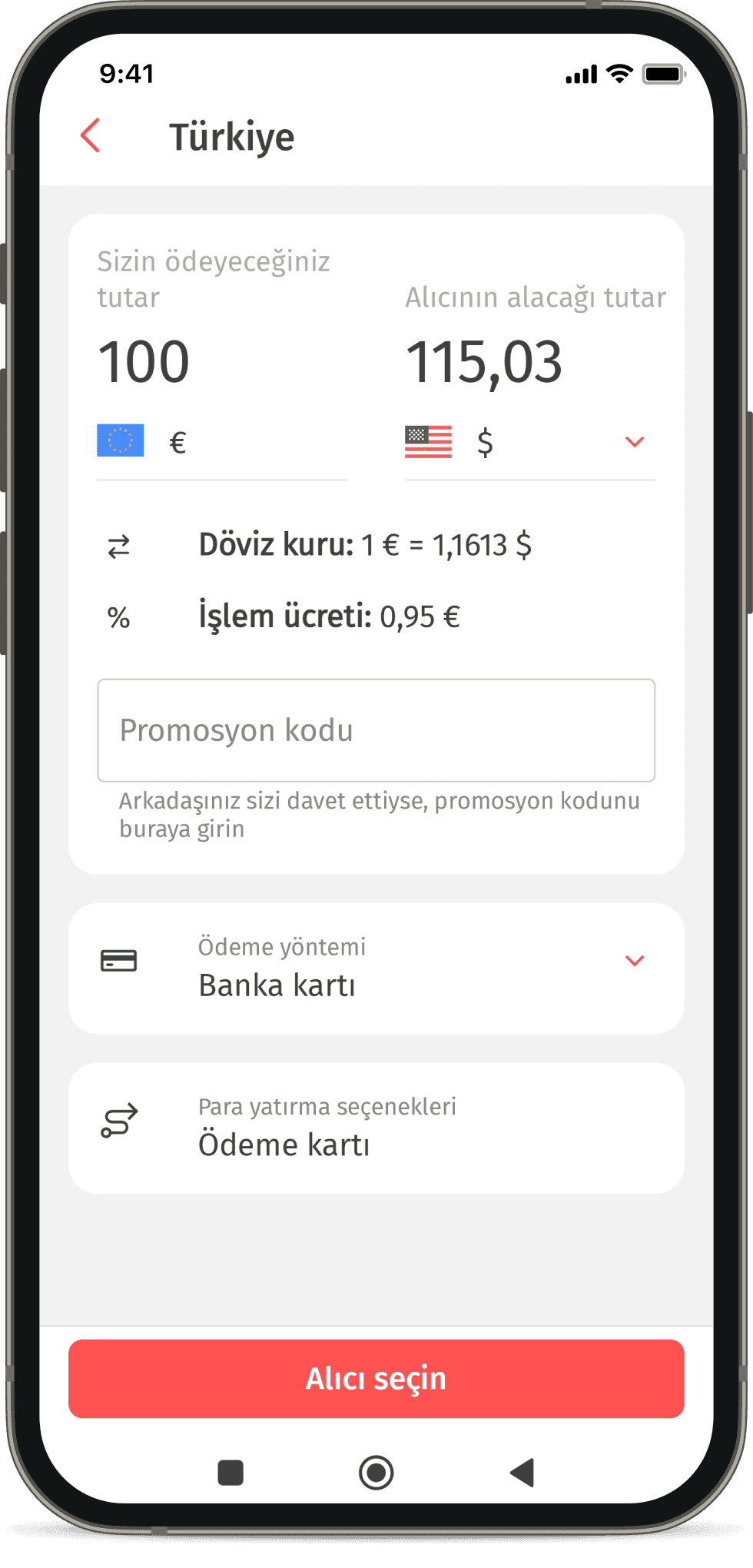 Kayıttan sonra, ana ekranda ‘Havale gönder’ butonuna tıklayın, para gönderim ülkesini ve alım şeklini seçin. Promosyon kodu alanı, döviz kuru ve komisyon bilgileri altında bulunur