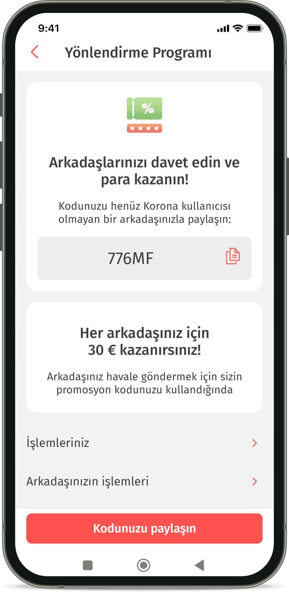 - 3Arkadaşınız 30 € kazanacak, siz de ‘Yönlendirme Programı’ bölümünde kendi özel promosyon kodunuzu alacaksınız. Korona uygulamasını önererek her davet ettiğiniz arkadaş için 30 € kazanabilirsiniz!